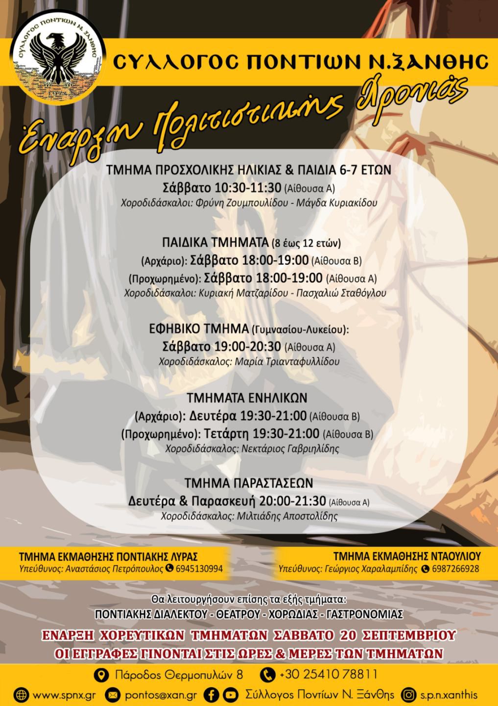 Ο Σύλλογος Ποντίων Νομού Ξάνθης ανακοινώνει την έναρξη των χορευτικών του τμημάτων για τη νέα χρονιά. Με μεράκι, αγάπη για την παράδοση και σεβασμό στην πολιτιστική μας κληρονομιά, καλούμε παλιούς και νέους φίλους να συμμετέχουν στα τμήματα εκμάθησης ποντιακών χορών.